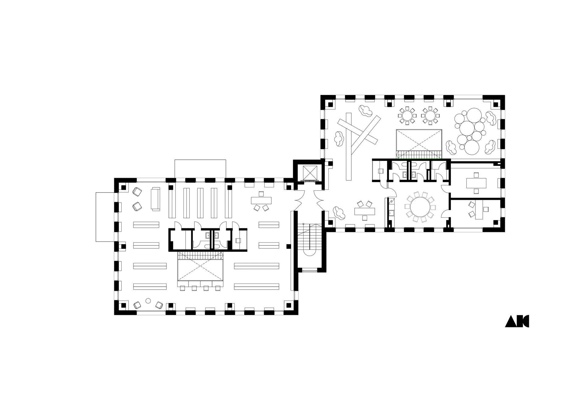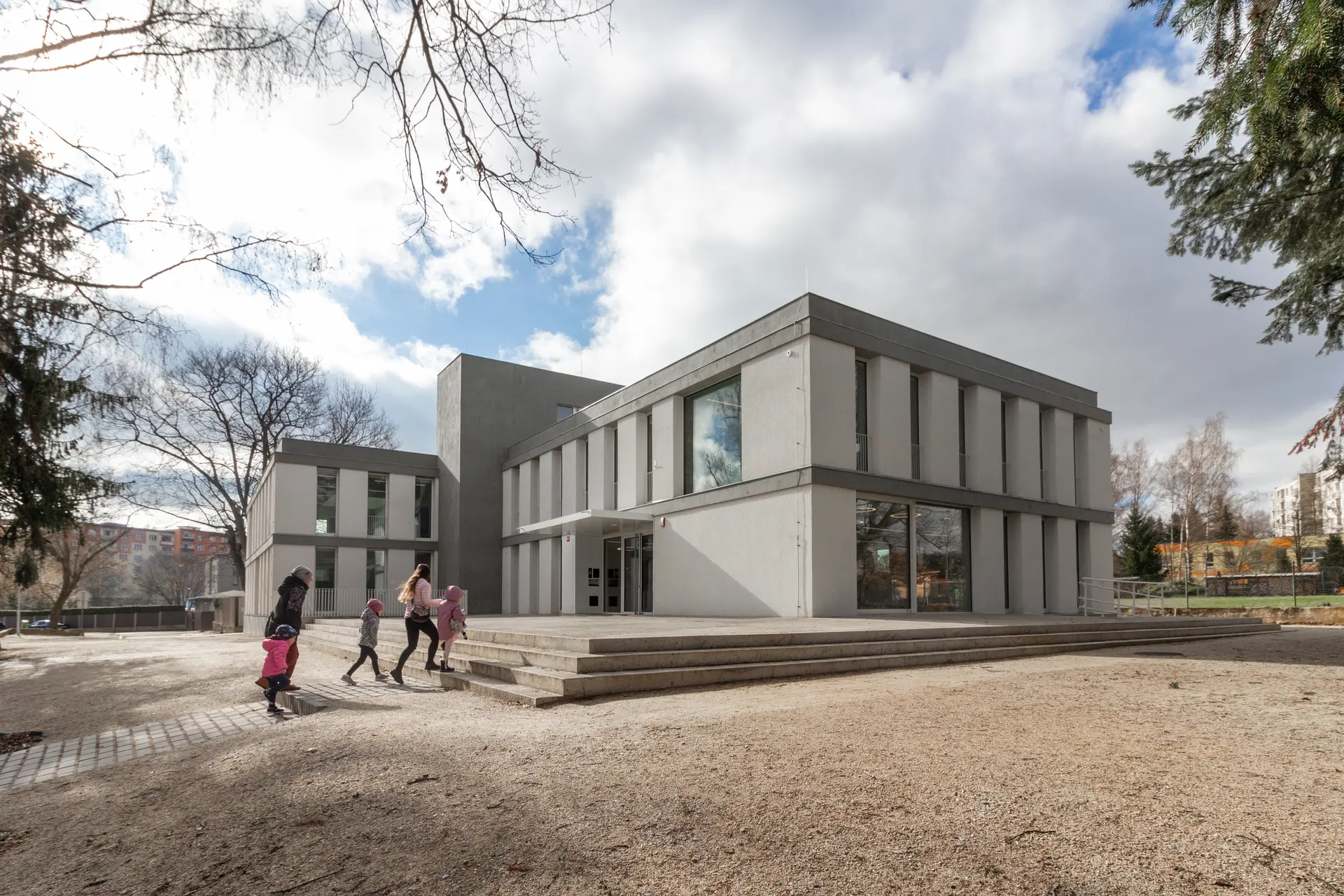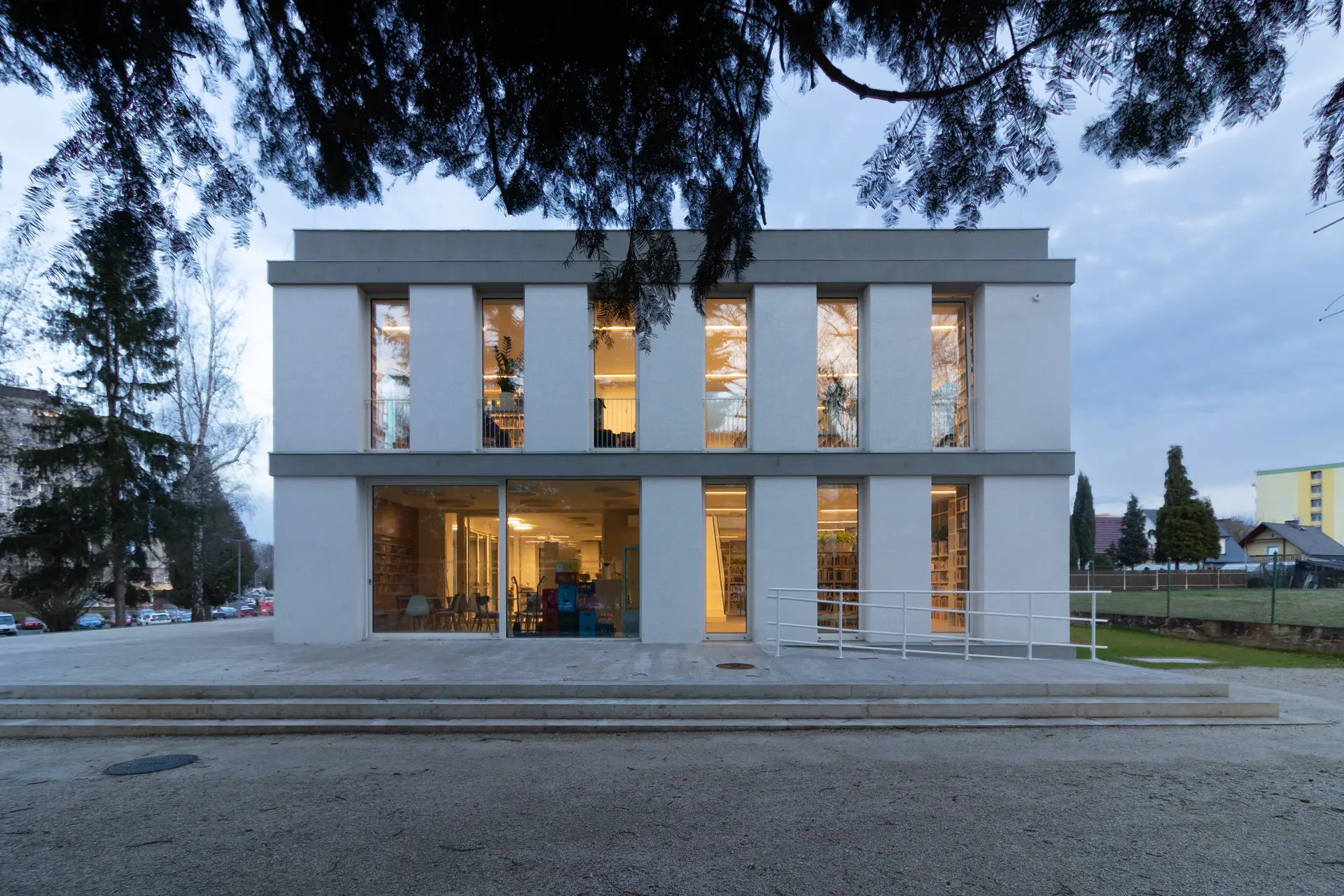 Struktura původního objektu předjímá funkční rozdělení objektu po jednotlivých objemech – severní část objektu je věnována dospělému oddělení, doplněnému o kavárnu a vstupní část, jižní část objektu je věnována dětskému oddělení, které je v patře doplněno o minimalizované administrativní zázemí knihovny s komunitní kuchyňkou. V suterénu je situován multifunkční sál s nezbytným zázemím a technická místnost. Sociální zázemí objektu jsou umístěna uprostřed dispozice tak, aby se maximálně využil prostor přirozeně osluněný denním světlem, komunikační jádro je umístěno na střihu obou objektů. V rámci projektu bezprostředního okolí jsou navrženy 3 typy veřejného prostoru: 1) vstupní – velkorysá vstupní platforma, kde je možné pořádat výstavy; 2) klidný – zastíněná klidná terasa, navazující na dětské oddělení a 3) slavnostní – pochozí terasa na střeše porostlé extenzivní zelení. Fasády abstrahované do pilířů a stropních desek naznačují významnou městskou funkci budovy – knihovny. Velkorysé otvory ve fasádě umožňují přímý kontakt mezi exteriérem a interiérem budovy. Probourání stropu a světlík uprostřed každé z budov umožňují prosvětlení dispozice a navozují pocit velkorysého prostoru v mezích nízké světlé výšky původní konstrukce.