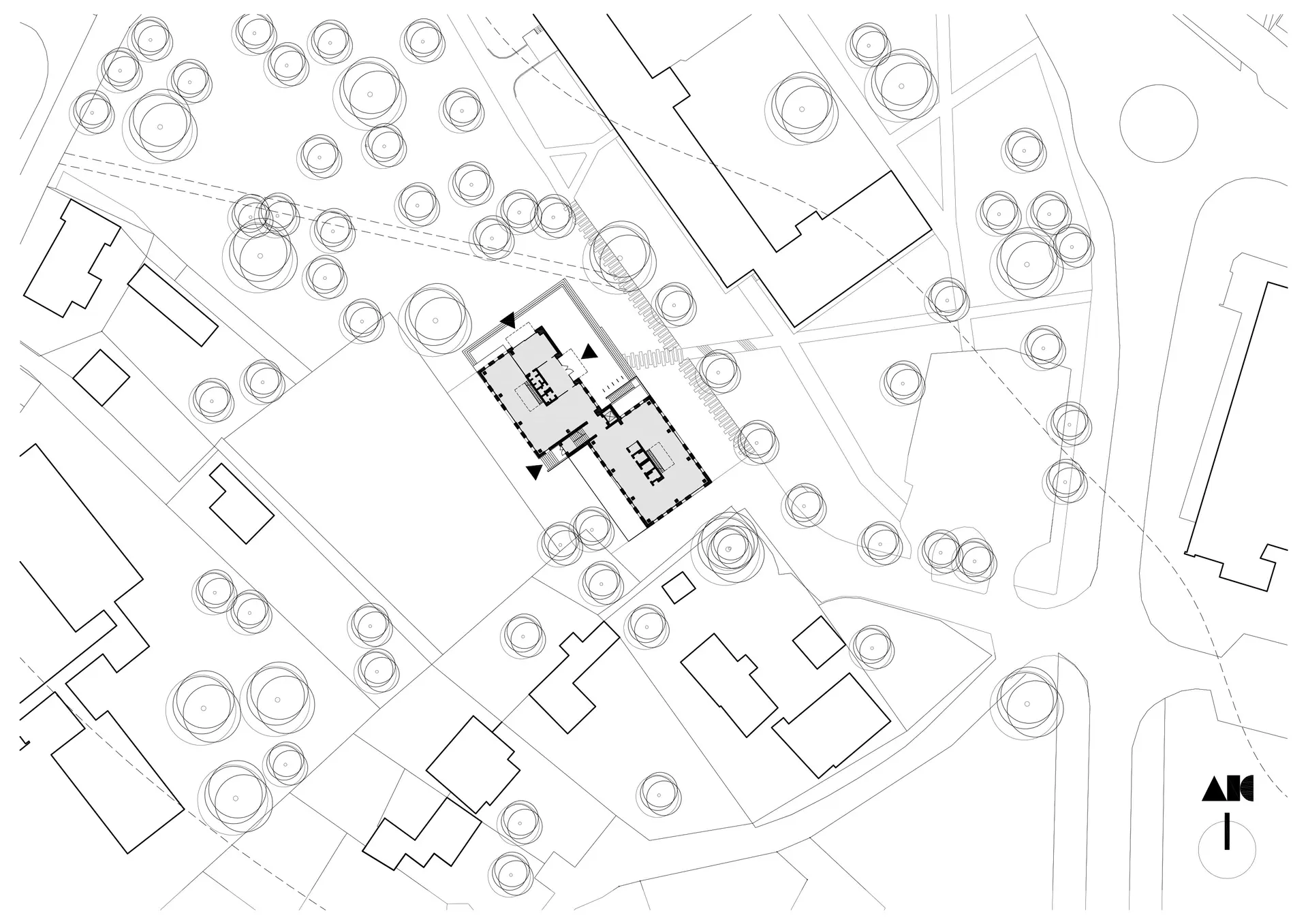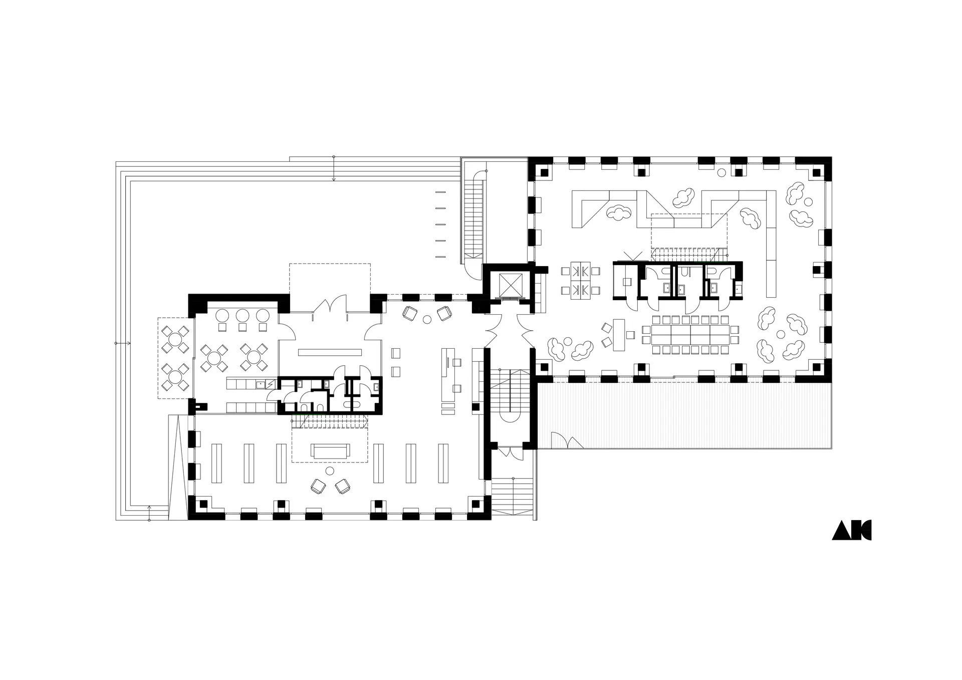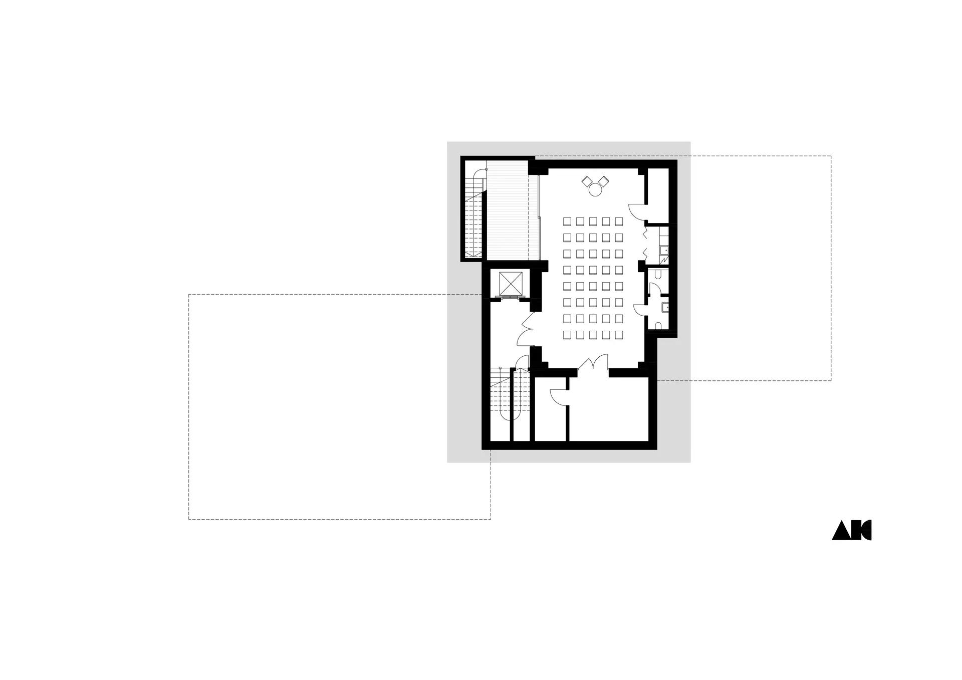 Struktura původního objektu předjímá funkční rozdělení objektu po jednotlivých objemech – severní část objektu je věnována dospělému oddělení, doplněnému o kavárnu a vstupní část, jižní část objektu je věnována dětskému oddělení, které je v patře doplněno o minimalizované administrativní zázemí knihovny s komunitní kuchyňkou. V suterénu je situován multifunkční sál s nezbytným zázemím a technická místnost. Sociální zázemí objektu jsou umístěna uprostřed dispozice tak, aby se maximálně využil prostor přirozeně osluněný denním světlem, komunikační jádro je umístěno na střihu obou objektů. V rámci projektu bezprostředního okolí jsou navrženy 3 typy veřejného prostoru: 1) vstupní – velkorysá vstupní platforma, kde je možné pořádat výstavy; 2) klidný – zastíněná klidná terasa, navazující na dětské oddělení a 3) slavnostní – pochozí terasa na střeše porostlé extenzivní zelení. Fasády abstrahované do pilířů a stropních desek naznačují významnou městskou funkci budovy – knihovny. Velkorysé otvory ve fasádě umožňují přímý kontakt mezi exteriérem a interiérem budovy. Probourání stropu a světlík uprostřed každé z budov umožňují prosvětlení dispozice a navozují pocit velkorysého prostoru v mezích nízké světlé výšky původní konstrukce.