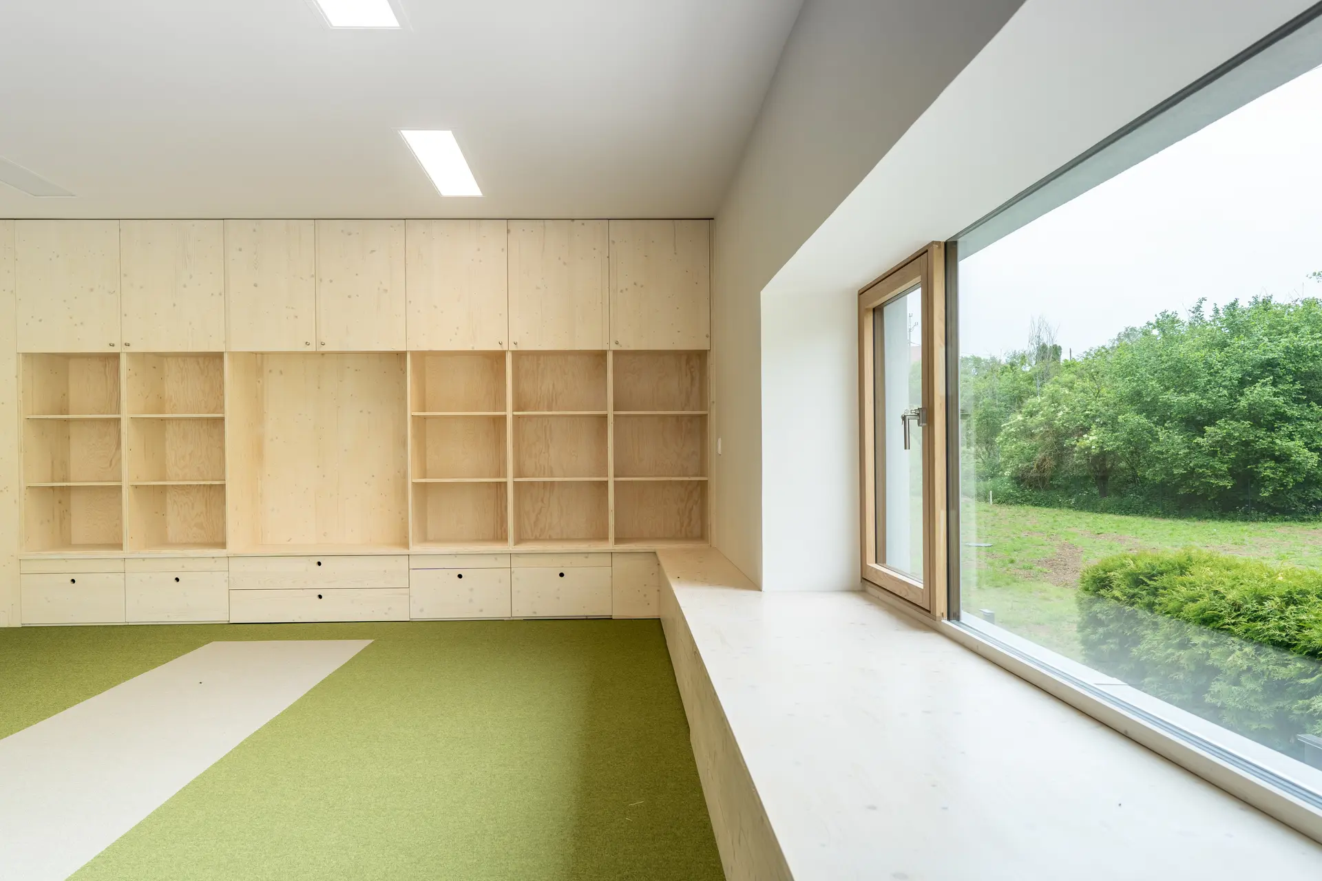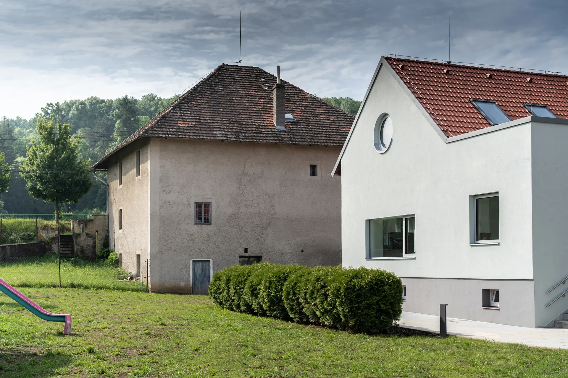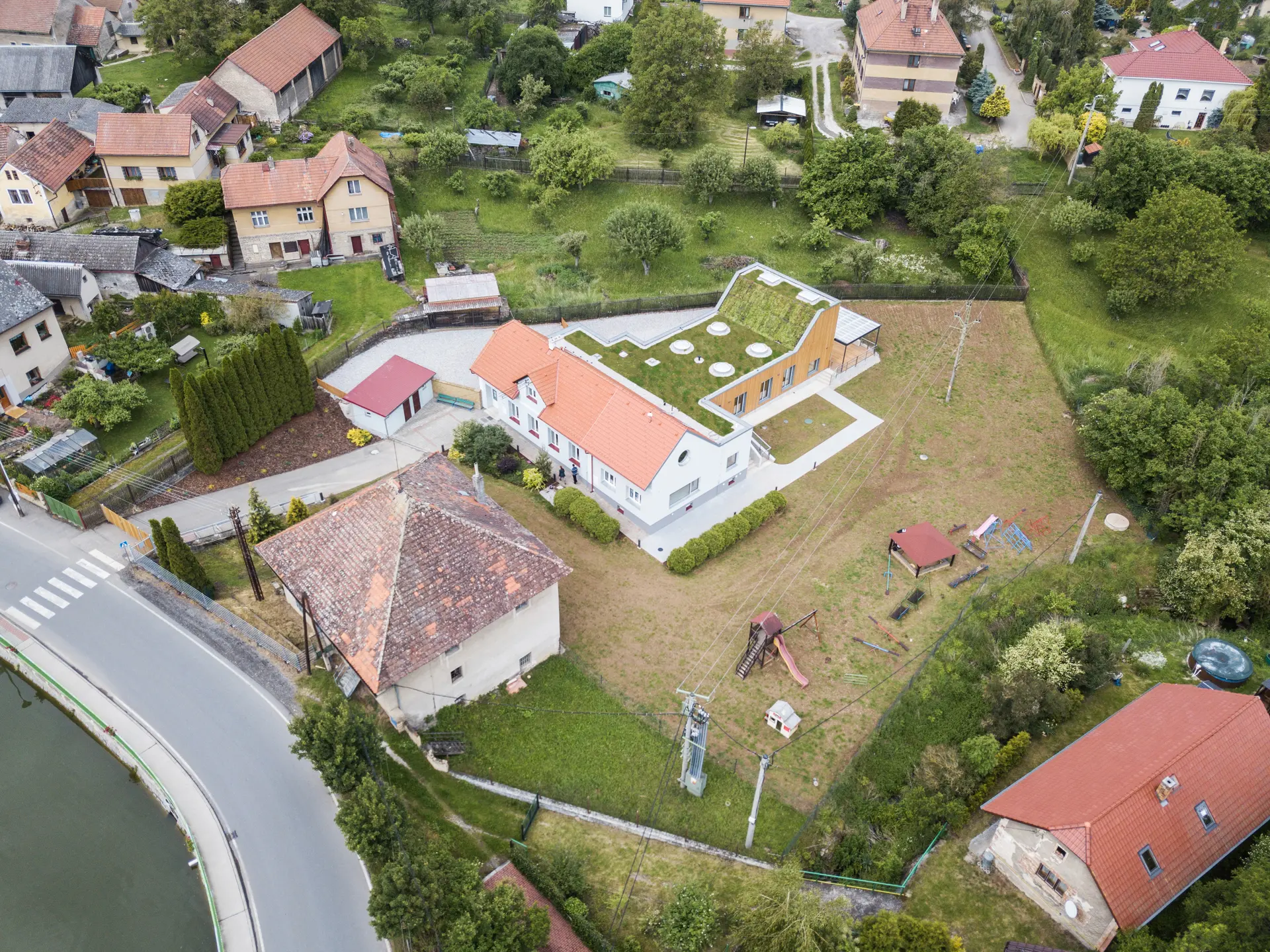 Z demografické studie vyplynula nutnost přistavět alespoň jednu třídu. Nakonec se z pouhé přístavby třídy stala komplexní úloha včetně stavebních zásahů do původní školky. Z původní budovy byl odstraněn nános přístaveb, prodloužením sedlové střechy byla budova sjednocena do jednoho objemu a v neposlední řadě byl z fasády odstraněn pastelkový nátěr zateplováků 90. let. Stará budova, více uzavřená, teď slouží nejmladším dětem. Ty mají striktně odděleny jednotlivé funkce a prostory – hernička s velkým sedacím oknem do zahrady, jídelna, spací místnost. Starší děti mají v nové přístavbě jeden volně plynoucí, jednoduše dělitelný prostor s vestavěným patrem v převýšené části, který umožní variabilnější výuku a hru dětí. V nové části je kladen důraz na přirozené osvětlení, přírodní materiály, propojení se zahradou. Přístavba je jednoduchá, vzdušná obdélníková hmota o rozměrech ca 10×15 m, je pohledově skryta za původní budovu MŠ a historickou budovu mlýna. Zelená střecha splývá se zahradou, aby větší hmota přístavby pohledově nenarušila drobné měřítko jádra obce. Velká francouzská okna se sníženým parapetem propojují novou třídu se zahradou, přímý přístup do ní je možný přes zastřešenou hrací terasu, která je v teplých dnech spojená s třídou velkým posuvným oknem. Přístavba je navržena z udržitelných materiálů – dřevěná konstrukce zateplená tepelnou izolací na bázi dřeva, opláštěná modřínovým laťováním, uvnitř přírodní marmoleum a nábytek z biodesek z tuzemského dřeva. Pohledové části jsou sladěny do světlých přírodních odstínů – světlá omítka (prodloužená hmota stávající budovy) a přírodní, dřevěný laťkový obklad. Barevnost do prostoru přinášejí hrající si děti a jejich výrobky. Velký důraz byl kladen na udržitelnost a energetickou nenáročnost budovy – celá přístavba je pokryta zelenou střechou, dešťová voda je zachytávána do akumulační nádrže a slouží k zálivce zahrady.
