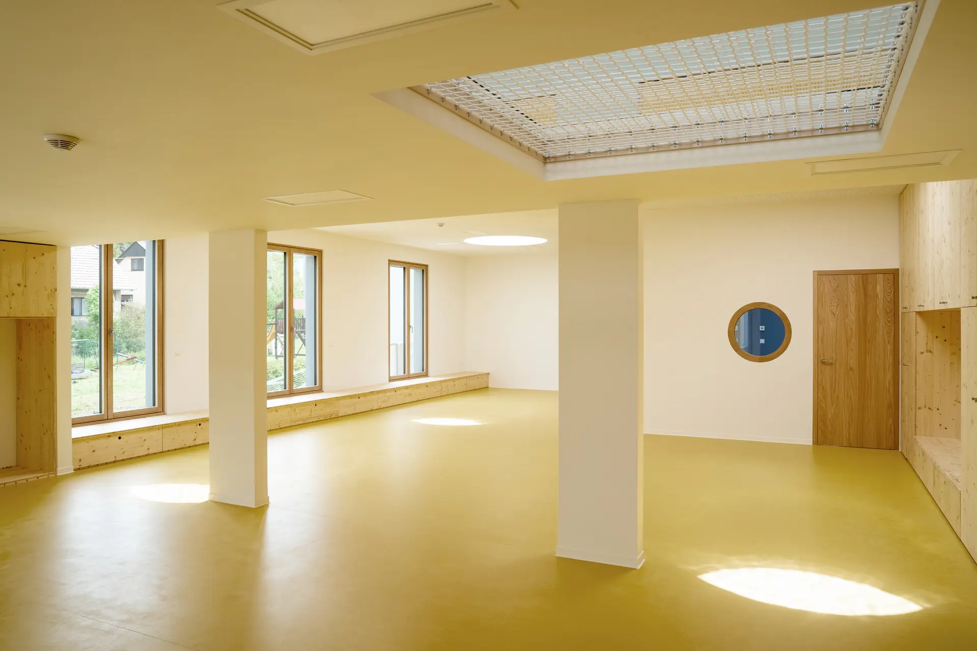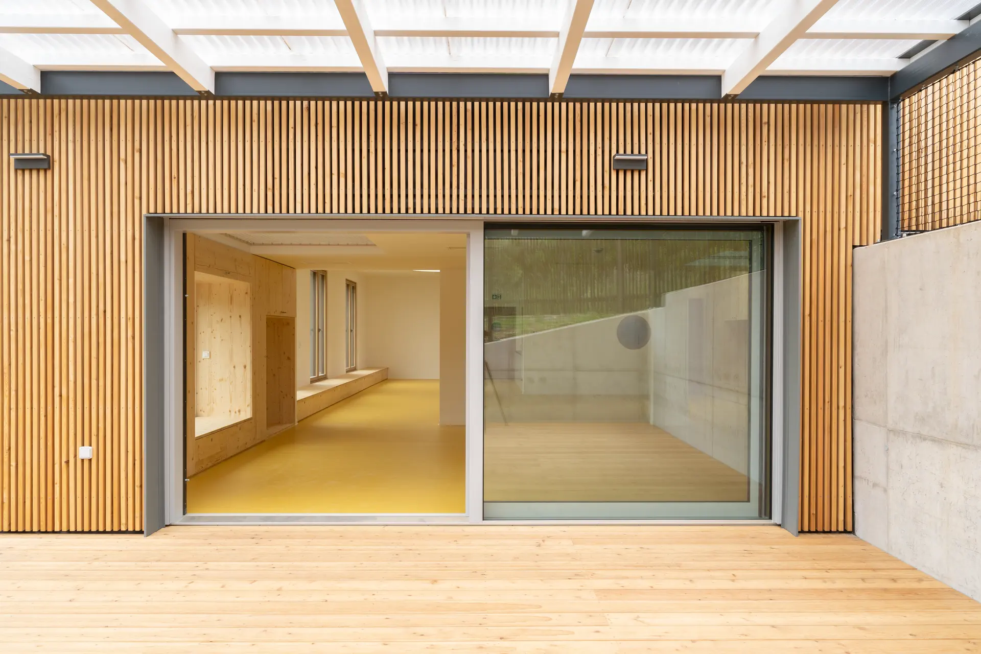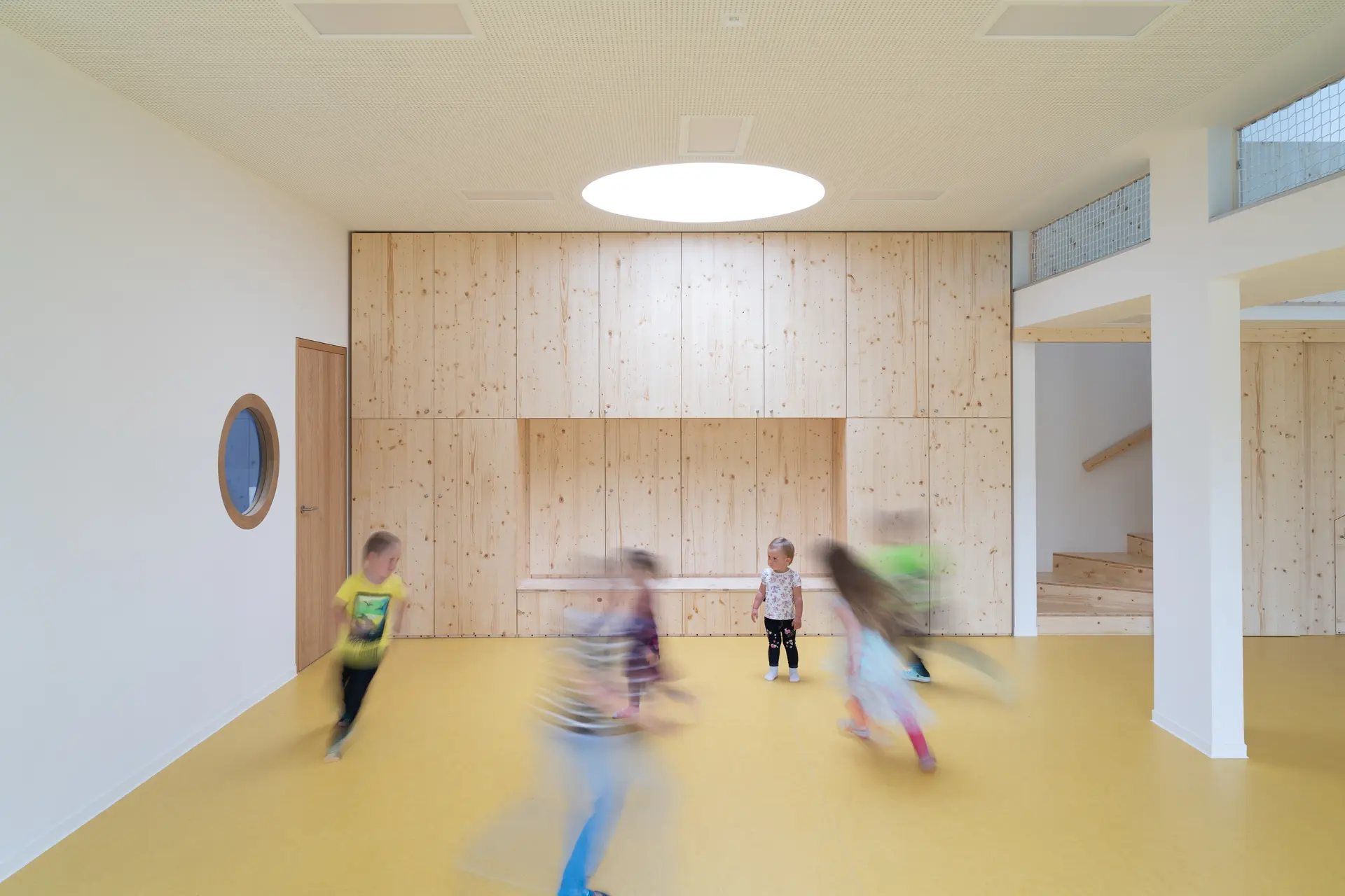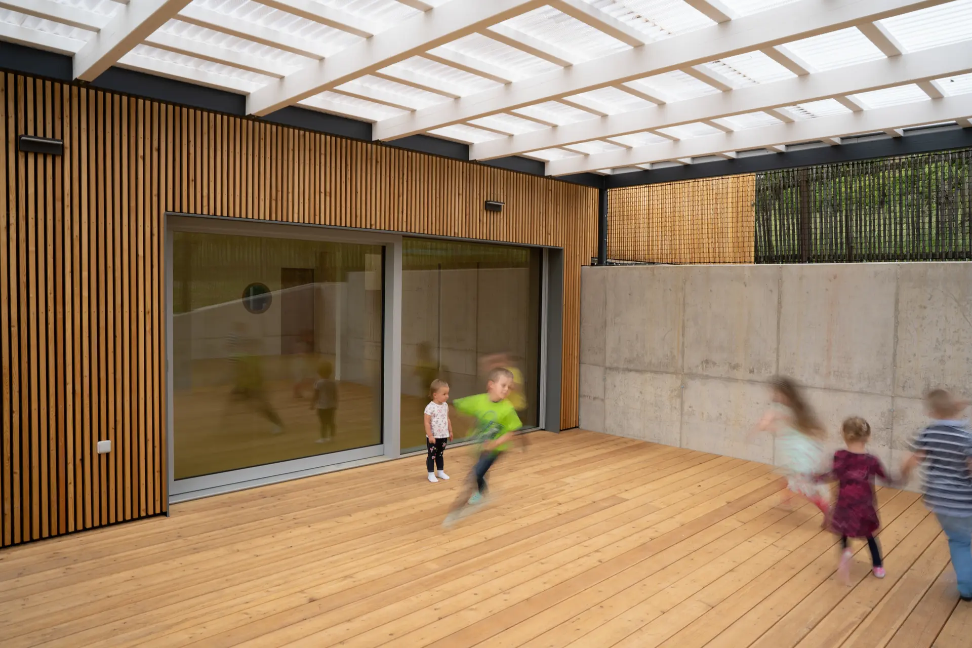 Z demografické studie vyplynula nutnost přistavět alespoň jednu třídu. Nakonec se z pouhé přístavby třídy stala komplexní úloha včetně stavebních zásahů do původní školky. Z původní budovy byl odstraněn nános přístaveb, prodloužením sedlové střechy byla budova sjednocena do jednoho objemu a v neposlední řadě byl z fasády odstraněn pastelkový nátěr zateplováků 90. let. Stará budova, více uzavřená, teď slouží nejmladším dětem. Ty mají striktně odděleny jednotlivé funkce a prostory – hernička s velkým sedacím oknem do zahrady, jídelna, spací místnost. Starší děti mají v nové přístavbě jeden volně plynoucí, jednoduše dělitelný prostor s vestavěným patrem v převýšené části, který umožní variabilnější výuku a hru dětí. V nové části je kladen důraz na přirozené osvětlení, přírodní materiály, propojení se zahradou. Přístavba je jednoduchá, vzdušná obdélníková hmota o rozměrech ca 10×15 m, je pohledově skryta za původní budovu MŠ a historickou budovu mlýna. Zelená střecha splývá se zahradou, aby větší hmota přístavby pohledově nenarušila drobné měřítko jádra obce. Velká francouzská okna se sníženým parapetem propojují novou třídu se zahradou, přímý přístup do ní je možný přes zastřešenou hrací terasu, která je v teplých dnech spojená s třídou velkým posuvným oknem. Přístavba je navržena z udržitelných materiálů – dřevěná konstrukce zateplená tepelnou izolací na bázi dřeva, opláštěná modřínovým laťováním, uvnitř přírodní marmoleum a nábytek z biodesek z tuzemského dřeva. Pohledové části jsou sladěny do světlých přírodních odstínů – světlá omítka (prodloužená hmota stávající budovy) a přírodní, dřevěný laťkový obklad. Barevnost do prostoru přinášejí hrající si děti a jejich výrobky. Velký důraz byl kladen na udržitelnost a energetickou nenáročnost budovy – celá přístavba je pokryta zelenou střechou, dešťová voda je zachytávána do akumulační nádrže a slouží k zálivce zahrady.